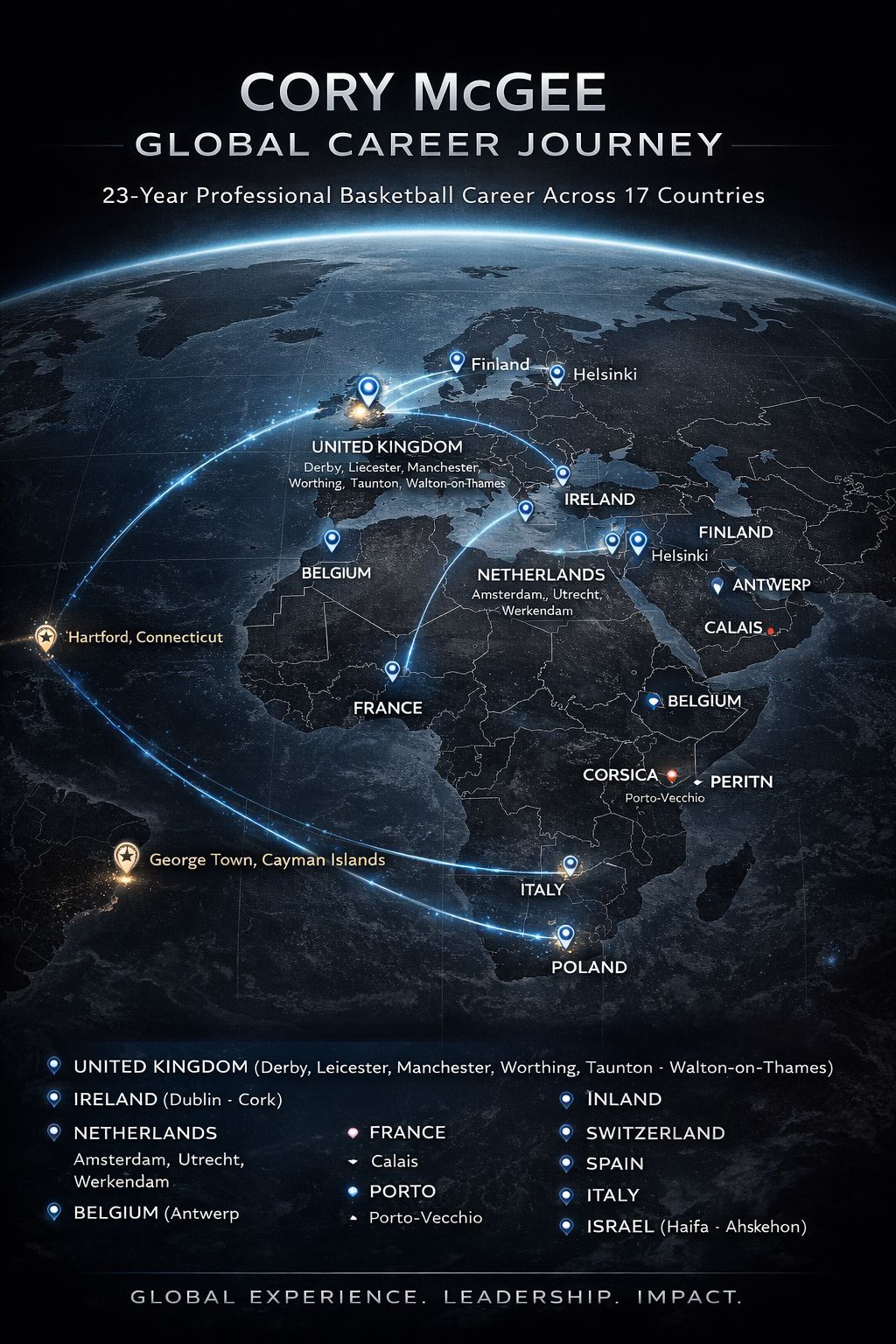 Having competed across 17 countries—including Spain, Italy, Germany, Israel, Portugal, the United Kingdom, and the Netherlands—McGee's journey reflects resilience, adaptability, and excellence at the highest levels of international sport. His career extends beyond performance on the court, highlighting leadership, cross-cultural communication, and the ability to represent brands and organizations across diverse markets.